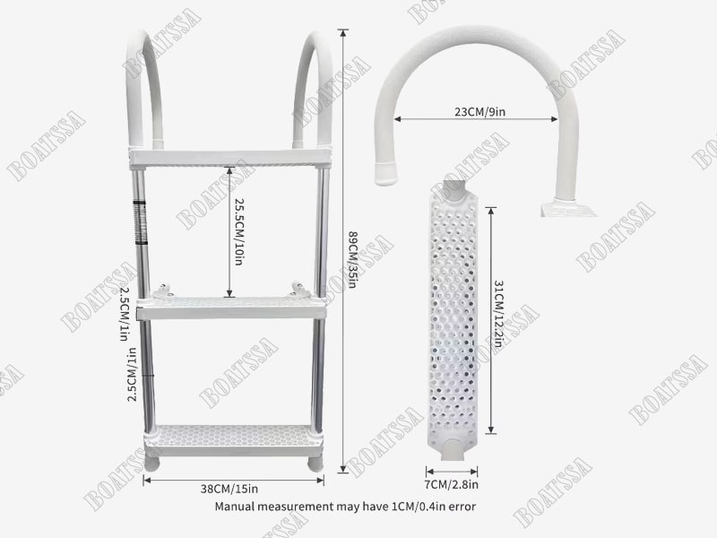 Made of 25mm marine grade anodized aluminum tubing, with non-slip polypropylene steps. These Ladders come complete with two stand-off feet to suit the contours of most hulls. The hooks fold flat for out-of-the way storage. *N*
