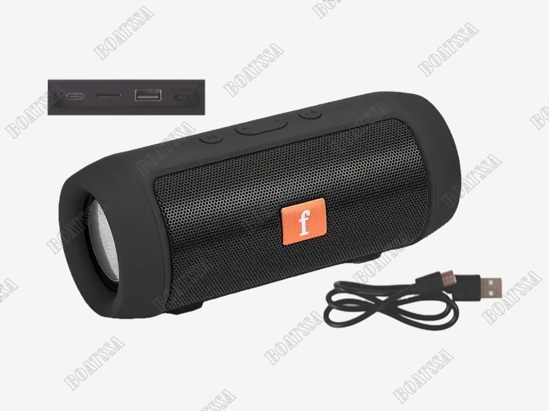 – Design: Matte black with a distinctive orange “f” logo and a metal side speaker.